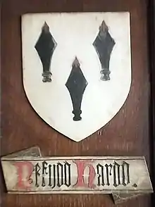 Conwy County Borough Council was granted a coat of arms by the College of Arms in 2001.[3] The new arms recall those of both Aberconwy and Colwyn Borough Councils. The main part of the shield depicts blue and silver waves for the river from which the county borough takes its name, and also recalls the gold and blue wavy field of Colwyn's arms. On top of the waves is placed a symbolic red tower, representing Conwy Castle. The chief or upper third of the shield is coloured green, the main colour in Aberconwy's arms. In the centre of the chief is a severed head from the heraldry of Marchudd ap Cynan, Lord of Abergele and Rhos. On either side are two black spears embrued, or having drops of blood on their points. These come from the reputed arms of Nefydd Hardd, associated with the Nant Conwy area. In front of each spear is a golden garb or wheatsheaf, for the rural areas of the county borough.