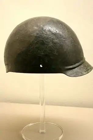 The Coolus helmet (named for Coolus, France) was a type of ancient Celtic and Roman helmet. It was typically made in bronze or brass and, like the Montefortino type with which it co-existed, was a descendant of Celtic helmet types. The explanation of the choice to use bronze can be attributed to the type of warfare that the helmet was used for; also the cultural affinities have influence on why the helmet was made the way that it was.[1] Within a long process of evolution, Roman military armor for the head developed from early pre-Roman helmets. Rome itself had no proper tradition of such objects, as most of the soldiers of the Early Republic made use of helmets produced by the Etruscans, whose craftsmen were known for their ability to make vessels.[2] The Canterbury helmet from England is an example.