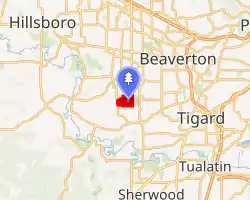 Cooper Mountain Nature Park is located on the south side of the 774-foot (236 m) tall Cooper Mountain in eastern Washington County.[3][4][6] The mountain, contrary to popular belief, is not a former volcano, but was formed due to basalt flows in the Tualatin Valley.[3] The park's natural areas include groves of oak trees, wetlands, prairie, ponds, and forested areas.[3] Metro owns the park, but will pay Tualatin Hills Parks and Recreation about $600,000 to maintain the park over a ten-year contract.[3] The 231 acres (93 ha) natural area is surrounded by agricultural lands to the south and urban development on the north.[7] Cooper Mountain is between Oregon Route 10 and Oregon Route 210 south of Beaverton.[7]