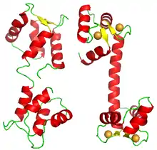Although most proteins showing cooperative binding are multimeric complexes of homologous subunits, some proteins carry several binding sites for the same ligand on the same polypeptide. One such example is calmodulin. One molecule of calmodulin binds four calcium ions cooperatively.[33] Its structure presents four EF-hand domains,[34] each one binding one calcium ion. The molecule does not display a square or tetrahedron structure, but is formed of two lobes, each carrying two EF-hand domains.