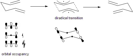 The Cope rearrangement is the prototypical example of a concerted sigmatropic rearrangement. It is classified as a [3,3]-sigmatropic rearrangement with the Woodward–Hoffmann symbol [π2s+σ2s+π2s] and is therefore thermally allowed. It is sometimes useful to think of it as going through a transition state energetically and structurally equivalent to a diradical, although the diradical is not usually a true intermediate (potential energy minimum).[5] The chair transition state illustrated here is preferred in open-chain systems (as shown by the Doering-Roth experiments). However, conformationally constrained systems like cis-1,2-divinylcyclopropanes can undergo the rearrangement in the boat conformation.