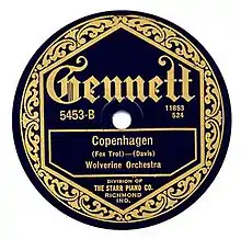 The Wolverines recorded it at Gennett Studios in Richmond, Indiana on May 6, 1924. The single was released by Gennett Records as 5453-B and also by Claxtonola Records as 40336-B as by the Jazz Harmonizers.[2] The A side was "Oh Baby", recorded at the same session. "Copenhagen" was published in the same year (in the Wolverines' arrangement) by the Melrose Bros. Music Company of Chicago, Illinois. At least nine other recordings of the song were released in 1924 alone. The Wolverines' recording features a brief cornet solo by Beiderbecke. Fletcher Henderson and His Orchestra recorded "Copenhagen" on October 30, 1924, five months after the Beiderbecke version.[3] The recording by Fletcher Henderson and His Orchestra, arranged by Don Redman, features a solo by Louis Armstrong.