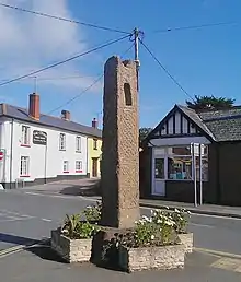 In the centre of the village, standing at the junction of the three parishes of Colebrooke, Crediton and Down St Mary,[2] is the Copplestone Cross, a granite pillar, said to be either a boundary stone[7] or the surviving shaft of a decorated late Saxon cross.[2] It stands 3.2 metres high, and is 0.6 metres square, covered with intricate relief sculpted decoration. The granite for the cross must have been brought some 9 miles from Dartmoor, which suggests it had some deep cultural significance. It was mentioned as Copelan Stan[7] in a charter dated 974.[8] Putta, the second and last Bishop of Tawton (reigned 906-910), was murdered in 910 whilst travelling from his see at Bishops Tawton, on the River Taw 2 miles south of Barnstaple in North Devon, to visit the Saxon viceroy Uffa, whose residence was at Crediton.[9][10] It is believed that Copplestone Cross, situated 6 miles north-west of Crediton and 22 miles south-east of Bishops Tawton, was erected in commemoration of his murder at this spot.[11]