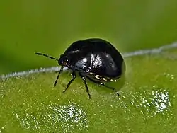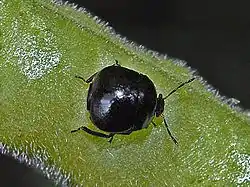 Coptosoma scutellatum can reach a size of about 4–5 mm. These small true bugs are almost spherical or trapezoidal in shape and shiny deep black, sometimes with green, blue or bronze gloss. The side edges of the abdomen are yellow. The scutellum covers the abdomen and the tarsus is bipartite.[2][3]