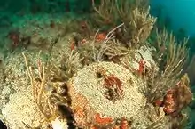In 2017 Hurricanes Maria and Irma caused severe damage to the coral reefs in Florida and Puerto Rico, impacting ecosystem vulnerability and resilience.[18] Funding to assist coral restoration was provided by the NOAA's CRCP and partners including the National Fish and Wildlife Foundation and National Marine Fisheries Service. The program led efforts to assess the impact of the hurricanes on local coral reef ecosystems and restore damage. The funds were used towards research and assessment to collect data on the impact of the hurricanes on the reefs and other crucial information, vital for effective decision-making. It was found that overturned coral reefs in Puerto Rico appeared to have macroalgal overgrowth, as evident in the figure, as a result of stress from the 2017 hurricanes. Scientists are concerned with the rapid growth of this macroalgae, and such findings are vital for effective management decision-making for the coral reef ecosystem[19]