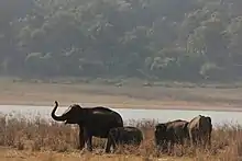 A major incident in the history of the reserve followed the construction of a dam at the Kalagarh river and the submerging of 80 km2 (31 sq mi) of prime low lying riverine area.[10] The consequences ranged from local extinction of swamp deer to a massive reduction in hog deer population.[10] The reservoir formed due to the submerging of land has also led to an increase in aquatic fauna and has additionally served as a habitat for winter migrants.[10]