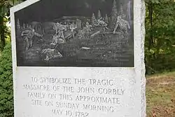 The Corbly family lived one mile north of Garards Fort, in southwest Pennsylvania at the John Corbley Farm.[1] The massacre occurred on Sunday morning, May 10, 1782, as the Corbly family traveled on foot to their place of worship. The Corbly family had left their home and were on their way to worship at a place where Reverend John Corbly was to preach. When Corbly discovered that the Bible, which he thought was in Mrs. Corbly's care, had been left at home, he returned to get it and then followed his family, meditating upon the sermon he was to preach.