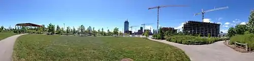 The Corktown Common was a CA$135 million project and it is a hilly park with pathways and prairie grasses, overlooking the mouth of the Don River, which doubles as a 8.5 m (28 ft)-high berm designed to protect the eastern downtown from a major flood, even a 500-year storm by shunting potential flood waters south toward the lake.[1] Its name before it opened was the Don River Park. The park was designed by Michael Van Valkenburgh Associates, and opened with over 700 trees and thousands of shrubs and grasses that are native to Southern Ontario's Carolinian forest ecosystem.[2]