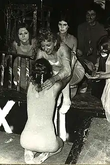 During the Johnson-Flax period, Corner Theatre presented work by talented playwrights, actors, and directors eager to contribute to the new and challenging works being produced at the theatre, including New York playwright Kit Jones' Watchpit, directed by Makarovich.[14] Makarovich also staged two Porterfield one-acts: The Catcher Was A Fag and I And Silence Some Strange Race, as well as an original teleplay called Tigers, among many others.[15] Another work by Porterfield, whatisoneholycatholicapostalicbrownandstinksuptheuniverse, was directed by Bruce Johnson, as was Porterfield's subsequent evening of thirteen short one-acts, Gnomes. In January 1972, future Sundance award-winning filmmaker Steve Yeager had his directorial debut with the premiere of Lee Dorsey's Pigeons.[16] In April 1973, Bruce Johnson suffered from a heart attack and was unable to finish directing Porterfield's latest evening of one-acts, Wolves. Director and playwright C. Richard Gillespie took over the production, which received excellent reviews.[17] Hugh M. Jones' Inconnue was a didactic theatrical adaptation of Artaud's The Theatre and its Double, featuring a performance by Judy Rowe and an original musical score by Baltimore composer Chuck Wagner.[18]