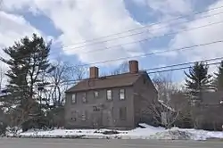 The Cornet Thomas Wiggin House is located north of the town center of Stratham, on the north side of Portsmouth Avenue at its junction with Depot Road. It is a 2+1⁄2-story wood-frame structure, with a side-gable roof, two interior brick chimneys, and a clapboarded exterior. The main facade is five bays wide, with a symmetrical arrangement of windows around a center entrance. The entrance includes an original wide six-panel door, flanked by tapered flat pilasters, which rise to a transom window and corniced entablature. This surround is believed to date to about 1830, when other alterations were made to the building. A two-story ell extends to the left, and a single-story ell extends to the rear, projecting slightly to the right side.[2]