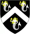 Supporters are figures usually placed on either side of the escutcheon which hold it up-right. In British heraldry, the use of supporters is restricted to peers, royalty, Scottish barons and chiefs of clans. However a number of Cornish families, such as the Carminows and the Trevanions, do possess supporters, despite not being of noble rank as required in Scottish or English heraldry. The Carminows use: dexter, A pelican and sinister, A Cornish chough. The Trevanions: dexter, A stag, sinister A lion.[26] The Trevelyan family had Two dolphins proper as their supporters. Treffry had A man and a woman as supporters[27] The St Legers of Cornwall used A wingless griffin.[28] The office of Lord Warden of the Stannaries gave entitlement to the use of supporters. Sir Walter Raleigh, Lord Warden of the Stannaries 1584-1603, used Two wolves as his supporters from 1584 onwards.[29]
