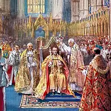 The Liber Regalis was translated into English for the first time for the coronation of James I in 1601, partly as a result of the reformation in England requiring services to be understood by the people,[16] but also an attempt by antiquarians to recover a lost English identity from before the Norman Conquest.[17] In 1685, James II, who was a Catholic, ordered a truncated version of the service omitting the Eucharist, but this was restored for later monarchs. Only four years later, the service was again revised by Henry Compton for the coronation of William III and Mary II.[18] The Latin text was resurrected for the 1714 coronation of the German-speaking George I, since it was the only common language between the king and the clergy. Perhaps because the 1761 coronation of George III had been beset by "numerous mistakes and stupidities",[19] the next time around, spectacle overshadowed the religious aspect of the service. The coronation of George IV in 1821 was an expensive and lavish affair with a vast amount of money being spent on it.[20]