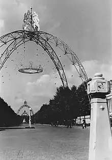 The arches were designed by Eric Bedford.[2] The tubular steel arches were floodlit[3] and were adorned with metalwork crowns and golden cane fan-shaped designs.[4][5] Sources describe them as being 70 or 85 feet (21 or 26 m) in height.[4]