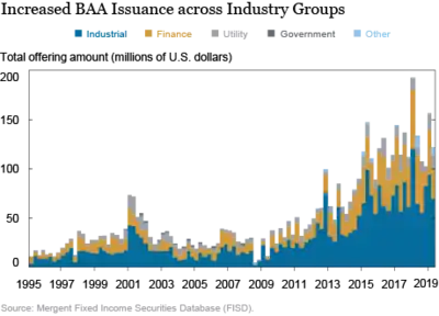 The Federal Reserve Bank of New York noted in January 2020 that only two U.S. firms had the highest rating of AAA, Johnson & Johnson and Microsoft, while there was an increased number of firms at the lowest-end, called BAA (on the Moody's rating scale) or BBB (on the S&P rating scale). Investment-grade firms, those with a rating between AAA and BAA, were more highly leveraged than the high-yield ("junk") firms. Observing that investors tend to divest bonds that are downgraded to high-yield, the New York Fed stated, "In the current corporate debt landscape, with a greater amount outstanding of BAA-rated corporate debt and higher net leverage of investment-grade debt overall, the possibility of a large volume of corporate bond downgrades poses a financial stability concern."[23]