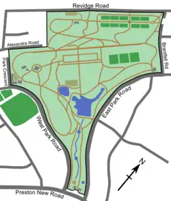 The 18 hectare (44.5 acre) park[1] occupies a relatively central location to the west of the main town centre precincts. The land is delineated to the north and south by two of Blackburn's main arterial roads. Revidge Road stretches for 490 metres (535 yards) along its northernmost edge; the grand southern entrance at Preston New Road (90 metres, 98 yards) arches away immediately along East and West Park Roads to reach its greatest width of 625 metres (685 yards) from Park Crescent to Brantfell Road.[6] The grounds can be entered from the main southern entrance, two entrances aside the east and west porter's lodges or ten other gates on the perimeter of the park.[1]