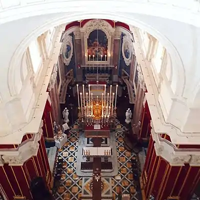 The titular altarpiece is The Last Supper by Lazzaro Pisani and is located in the choir. It was commissioned by the then-curator and vice-parish priest the Rev. Fr. Carmelo Caruana. The painting was installed in 1917. By 2007, due to the weight of the canvas itself, creases were forming in the painting and it was getting unstuck from its frame. BOV sponsored the restoration.[2] The restoration was carried out by Emanuel Zammit, from Żejtun following his other works in the Cathedral of the Assumption in Gozo.[3]