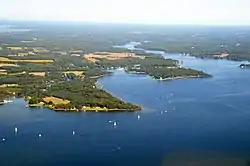 The Western Branch starts between Bar Point and West Point which points northwest. The Merry Point cable ferry is located near the start of the branch that runs between Ottoman Wharf and Merry Point.[1] In the order they are encountered headed up the branch, the creeks are John Creek, Lowrey Creek, Senior Creek, and Davis Creek. From there, the branch forks into two, the eastern fork ending at Belwood Swamp, approximately one mile west of Lancaster Courthouse, and the western fork, Little Branch, ends at Griffins Landing.