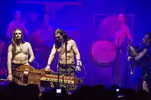 Corvus Corax is a German band known for playing neo-Medieval music using authentic instruments. Their name is the Latin name for the common raven. The band was formed in 1989 by Castus Rabensang, Wim (Venustus) and Meister Selbfried ("Master Selfpeace") in East Germany. The band often uses bagpipes as the solo instrument; their live performances attract attention with the bizarre look of the musicians being reminiscent of ancient Greek myths: half-naked, dressed in unusual clothes, wearing primitive tribal decorations, often tattooed.