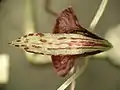 Corybas papillosus dorsal view, showing the slender, acuminate dorsal sepal extending well past the labellum.