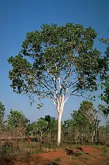 Corymbia grandifolia, commonly known as the cabbage gum,[2] large-leaved cabbage gum and the paper-fruited bloodwood,[3] is a species of tree that is endemic to northern Australia. It has smooth bark, egg-shaped to broadly elliptic to lance-shaped adult leaves, flowers buds in groups of three or seven, creamy white flowers and cup-shaped to cylindrical fruit.