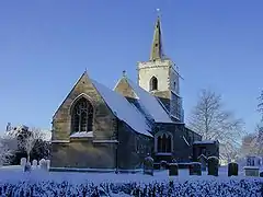 The oldest building in Coton is St Peter's Church (there are some pictures and a description of the church at the Cambridgeshire Churches website[7]), built in the 12th century as a chapel, dependent on Grantchester church. It gradually established its independence from Grantchester over the course of the 13th and 14th centuries. Some of the original building survives, including the nave (excluding its aisles), the chancel and the font. The shafted south-east angle of the 12th century nave is still visible outside, while the chancel has 12th century windows to the north and south. The aisles date from the 14th and 15th centuries. Extensive restoration work was undertaken in the 1870s and 1880s.[8]