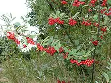 The globose fruits mature in August. They are 6–8 mm in diameter, red and contain 4 or 5 pyrenes.