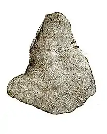 While working at the Fabriksproduktenkabinett, he began to examine iron meteorites along with Karl von Schreibers. They polished and etched the surface of iron meteorites with dilute nitric acid and noticed that it revealed a patterning of cross-hatched lines that came to be called Widmanstätten patterns.[1][2] He examined by flame-heating a slab of Hraschina meteorite.[3][4] The different iron alloys of meteorites oxidized at different rates during heating, causing color and luster differences.[5] In 1813 he made imprints of these structures with printing ink and paper. These were unpublished during his life. A print of the structures from the Hraschina meteorite collected in 1751 was used in a supplement to the book Über Feuer-Meteore, und über die mit denselben herabgefallenen Massen of Ernst Chladni which was published by Schreibers in 1820 as Beiträge zur Geschichte und Kenntniss meteorischer Stein und Metallmassen.[6] Schreibers named the structure after Widmanstätten and the term is widely used in metallurgy.[7][8]
