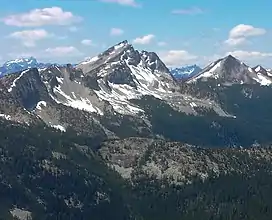 Courtney Peak is an 8,392-foot (2,558-metre) mountain summit located in the Methow Mountains, a sub-range of the North Cascades in Washington state. Situated on Sawtooth Ridge, Courtney Peak is part of the Lake Chelan-Sawtooth Wilderness, a protected area within the Okanogan–Wenatchee National Forest. Courtney Peak ranks 78th on Washington's highest 100 peaks, and 81st on the "Bulger List".[1] The nearest higher peak is Star Peak, 0.83 miles (1.34 km) to the southeast.[1] Precipitation runoff on the west side of the mountain drains into nearby Lake Chelan via Fish Creek, whereas the north side of the mountain drains into Oval Creek, and the east side drains into Buttermilk Creek, both of which are tributaries of the Twisp River. The mountain's name was officially adopted in 1985 to remember James (Ray) Courtney (1920-1982), a commercial packer and lifelong resident of Stehekin.[4] The immediate vicinity of this peak was a favorite destination for his guided outings. Ray Courtney died in an accident while leading such a pack trip with 29 hikers when the horse he was riding lost its footing and fell down a gully.[4]