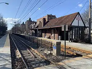 The station comprises two side platforms west of the intersection. There is a relatively large Tudor-style station house on the westbound platform.