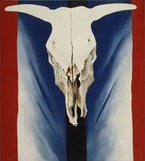 Cow's Skull: Red, White, and Blue is a painting by American artist Georgia O'Keeffe. The painting depicts a cow skull centered in front of what appears to be a cloth background. In the center of the background is a vertical black stripe. On either side of that are two vertical stripes of white laced with blue. At the outside of the painting are two vertical red stripes.