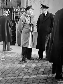 ![]() Cowley Thomas (right) with Commodore Mulhall, RNR, Commodore of the first convoy of Coasters to arrive at Antwerp | |