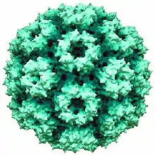 CCMV is composed of an icosahedral protein capsid (T=3)[1] that is 28 nm in diameter. This capsid is constructed by 180 identical protein subunits each with a primary structure of 190 amino acid residues. There are three subunits are distributed over the virus coat, A, B, and C. The A subunits are arranged in pentamers and the B and C subunits are together arranged in hexamers. The virus coat is built up from 12 pentamers and 20 hexamers. Inside the capsid lies the (+)ssRNA genome consisting of around 3000 nucleotides.[2] The genome is divided into three parts (RNA-1-3) with a subgenomic portion referred to as RNA4.[1] RNA-1, with a heavy density, is surrounded by its own capsid. RNA-2, with a light density, also has its own capsid. Because RNA-3 and RNA-4 are medium-density, they are encapsidated together. RNA-1 and RNA-2 are thought to be involved in viral replication while RNA-3 has a role in the spread of infection throughout the plant.[3] When RNA-3 is deficient, virus replication still does occur, just at a significantly reduced level. Due to these four species of single-stranded, positive sense RNA molecules, the CCMV genome codes for four separate genes.[2]