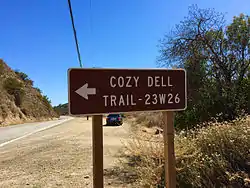 Cozy Dell Canyon is a canyon in the Topatopa Mountains immediately north of Meiners Oaks and three miles northwest of the Ojai Valley in central-western parts of Ventura County, California. It is located between Sheldon Canyon, Kennedy Canyon and McDonald Canyon, immediately east of the Ventura River.[1] It is situated in the Los Padres National Forest and may be reached from numerous trailheads including the Cozy Dell Trail located in Ojala. It is the type locality for the Cozy Dell Shale and the name was first applied in 1928 by Kerr and Schenck.[2] It is recognized for its natural beauty, creeks and creek beds, endemic wildflowers, diverse wildlife, rock formations, as well as panoramic views of surrounding mountains and the entire Ojai Valley.