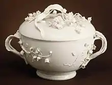 The factory was started by Geminiano Cozzi, a banker from Modena,[4] who had been involved with Nathaniel Friedrich Hewelcke, a German porcelain retailer from Dresden (near Meissen), who had moved to Venice. Hewelcke began producing porcelain there in 1758,[5] with Cozzi as a partner in the venture.[6] But by 1763 the factory had closed, with surviving pieces vanishingly rare.[7] The Hewelcke factory made the first porcelain produced in the city since Vezzi porcelain ceased production in 1727. In the meantime, in 1735 Doccia porcelain, near Florence, began production; it became the most important Italian porcelain factory, and continues in the 21st century.[8]