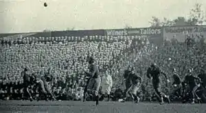 The 1930 game proved to be the first competitive match of the series. Navy scored the only points with a 65-yard touchdown run on the second play of the game. The remainder was a defensive struggle, and Navy and Maryland advanced to the opposing one- and nine-yard lines, respectively, before being rebuffed.[9] The 1931 match-up was held for the first time at a neutral site, Griffith Stadium in Washington, D.C. In the first Maryland win of the series, the Terrapins scored the only points on a trick "triple-pass" play.[8][10] The Maryland administration put a halt to the series in 1934 amidst claims that Navy scored the winning go-ahead, 16–13, on an illegal play after reviewing game tape.[2][7]