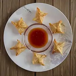 The filling is made with a combination of cream cheese, crab meat or imitation crab meat, scallions or onion, garlic, and other flavorings.[3][4][5][6] A small amount of the filling is wrapped in each Chinese wonton wrapper. The dumpling is then shaped by either folding the wrapper over into a triangle,[1][3][7][8][9] by creating a four-pointed star,[1][2] by gathering it up into a flower or purse shape,[1][5] or by twisting it into the traditional wonton shape.[6]