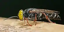 The Crabronidae are a large paraphyletic group (nominally a family) of wasps, including nearly all of the species formerly comprising the now-defunct superfamily Sphecoidea. It collectively includes well over 200 genera, containing well over 9000 species. Crabronids were originally a part of Sphecidae, but the latter name is now restricted to a separate family based on what was once the subfamily Sphecinae. Several of the subfamilies of Crabronidae are often treated as families in their own right, as is true of the most recent phylogenies (example below).