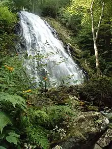 Crabtree Falls is a 70 ft. cascade on Big Crabtree Creek. The creek spreads over a rock face with many small ledges, giving it a delicate appearance, before trickling into a clear pool at the base. Though there are hardly any crabtrees here now, in the spring, an impressive array of wildflowers abound on the trail, including four species of trillium.[1] By July, ferns fill the forest and soak in the spray of the falls, with rosebay rhododendron in bloom.