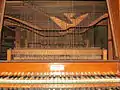 Additional view of the action. The slightly different view shows more of the rotating rods under the swell box which transmit the motion sideways to line up with pipes.
