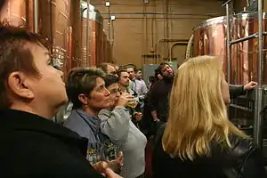 Facility tours are interactive experiences in which visitors of a brewery are guided through the facilities of the brewery by either a tour guide or beer maker. Visitors are educated on the different processes in a brewery from canning and bottling to the fermentation process. Tour guides will often explain the history of the brewery highlighting certain aspects of the breweries founding, and the tours sometimes come with a complimentary tasting.[18] Dog Fish Head's facility tour in Milton, Delaware costs $30 per tour and tour-goers are given complete access to the facility, and are gifted with a complimentary tasting and souvenir beer glass.[19]