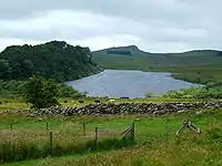 Crag Lough is an inland lake at the southern edge of Northumberland National Park, 2.5 miles (4.0 km) north of Bardon Mill, and 0.5 miles (0.8 km) north of the B6318 Military Road in Northumberland, northern England. At this point Hadrian's Wall is at the top of a line of crags, the Whin Sill, with Crag Lough at the foot of the crags.[1][2][3]