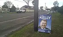 In the lead-up to the 2016 election, the moderate faction of the Liberal party planned to challenge Kelly in his seat.[33] Radio commentator Alan Jones threw his support behind Kelly,[34] and Prime Minister Turnbull wrote a letter of endorsement, stating that Kelly was one of the government's "most consistent performers" and that Kelly had a "fine reputation".[35] Tony Abbott had also "pushed aside moderate challengers" to Kelly when Abbott was Prime Minister.[6] The redistribution of Hughes was thought to strengthen Kelly's hold on the seat,[36] and Kelly was returned with a margin greater than 9 points, despite a small swing against him.[37]