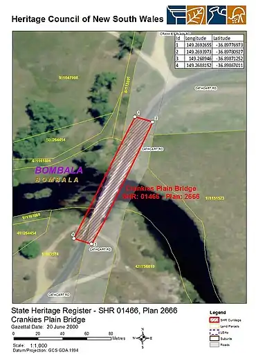 - "Crankies Plain Bridge". New South Wales State Heritage Register. Office of Environment & Heritage. H01466. Retrieved 2 June 2018.