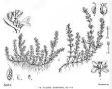 The main stems grow along the ground, rooting at the nodes. The lateral stems are erect. The small spoon to lance-shaped leaves are reddish at the base with the upper leaves concave and the lower convex; they are 2.8–4.2 mm long and 1.1–1.5 mm wide. The single flowers appear in the axils of the upper leaves; they appear from January to March: they have pink sepals and white petals about 2.5 mm long. The fruits have four seeds, each about 0.8 mm long and roughly oval in shape.[1]