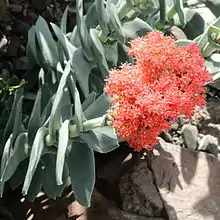 Crassula perfoliata var. falcata, known as the airplane plant or airplane propellers, has gained the Royal Horticultural Society's Award of Garden Merit.[3] Growing to 1 m (3.3 ft) tall and broad, this succulent evergreen subshrub has grey erect leaves and scarlet flowers in summer. As it does not tolerate freezing temperatures, in temperate zones it must be grown under glass using a cactus compost.