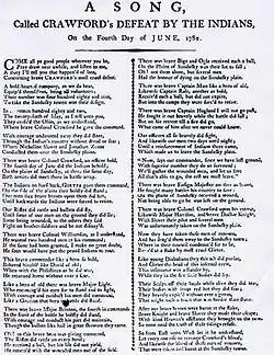 "Crawford’s Defeat by the Indians" is an early American folk ballad principally written by Doctor John Knight,[1][2] survivor of the 1782 Crawford Expedition. The expedition was intended to destroy American Indian towns along the Sandusky River and was one of the final operations of the American Revolutionary War. The ballad, "Crawford's Defeat," contains a great deal more history than poetry, however. It was long after a favorite song upon the frontier[3] and was sung to various tunes.[4] In fact, Doctor Knight's narrative was an immediate success. Its depiction of a brave officer's death at the hands of fiendish savages drew wide admiration and scenes of a rolling landscape delighted eastern land speculators. Though a year elapsed before Indian Atrocities: Narratives of the Perils and Sufferings of Dr. Knight and John Slover was printed, the delay apparently did nothing to reduce its appeal. If anything, the delay probably increased public interest, for all the while the ballad, "Crawford's Defeat," was being sung.[5] Another ballad, titled "Saint Clair's Defeat", was later based on "Crawford's Defeat". It depicts the Battle of the Wabash, which was fought on November 4, 1791, in the Northwest Territory between the United States and the Western Confederacy of American Indians.