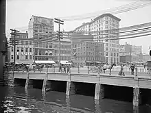 The Crawford Street Bridge was a concrete and steel bridge over the Providence River in downtown Providence, Rhode Island. It was originally built from 1873 to 1904 and then rebuilt starting in 1930. Composed of a set of interconnected bridges that span the river, it had a total area of over 3 acres (1.2 hectares) and covered nearly a quarter of a mile of the river. At 1,147 feet (350 m) wide,[2] it was the world's widest bridge, and listed in the 1988 Guinness Book of World Records.[3]