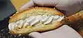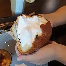 Another specific national version is the Hong Kong sweet bun.[2] It is one of the most standard pastries in Hong Kong. It can also be found in most Chinatown bakery shops.[3] The bun has either butter cream or whipped cream filling down the middle with coconut sprinkles on the outside. Variations of it include the "Cream Horn", a pastry in a spiral shape, much like a horn, filled with cream.