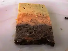 The dish is usually baked and inverted. It comprises a minimum of three or four layers of different colored omelettes, often given by red tomatoes, orange carrots, green spinach or chard, and black olives. Peppers, with their variety of colors also allows for multicolored crespéou. Some preparations use sausage or sliced fish for a beige layer. In Nice, there is always an omelette made from chard ribs.[1] Other vegetables can be used, such as zucchini, eggplant, onion, or basil.[3]