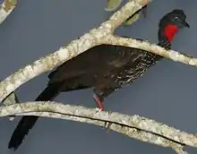 The crested guan (Penelope purpurascens) is a member of an ancient group of birds of the family Cracidae, which are related to the Australasian megapodes or mound builders (Megapodiidae). It is found in the Neotropics, in lowlands forests ranging from south Mexico and the Yucatán Peninsula to western Ecuador and southern Venezuela. The sexes are similar in appearance; the plumage is mainly dark brown with white spotting, an area of bare skin round the eye, bright red wattles, a bushy crest, a long broad tail and pink legs. It is a social bird, often seen in pairs or small family groups. It feeds in trees, mainly on fruit, and builds a nest of twigs on a branch. The two or three white eggs are incubated by the female. The International Union for Conservation of Nature has rated this bird's conservation status as "Near Threatened".